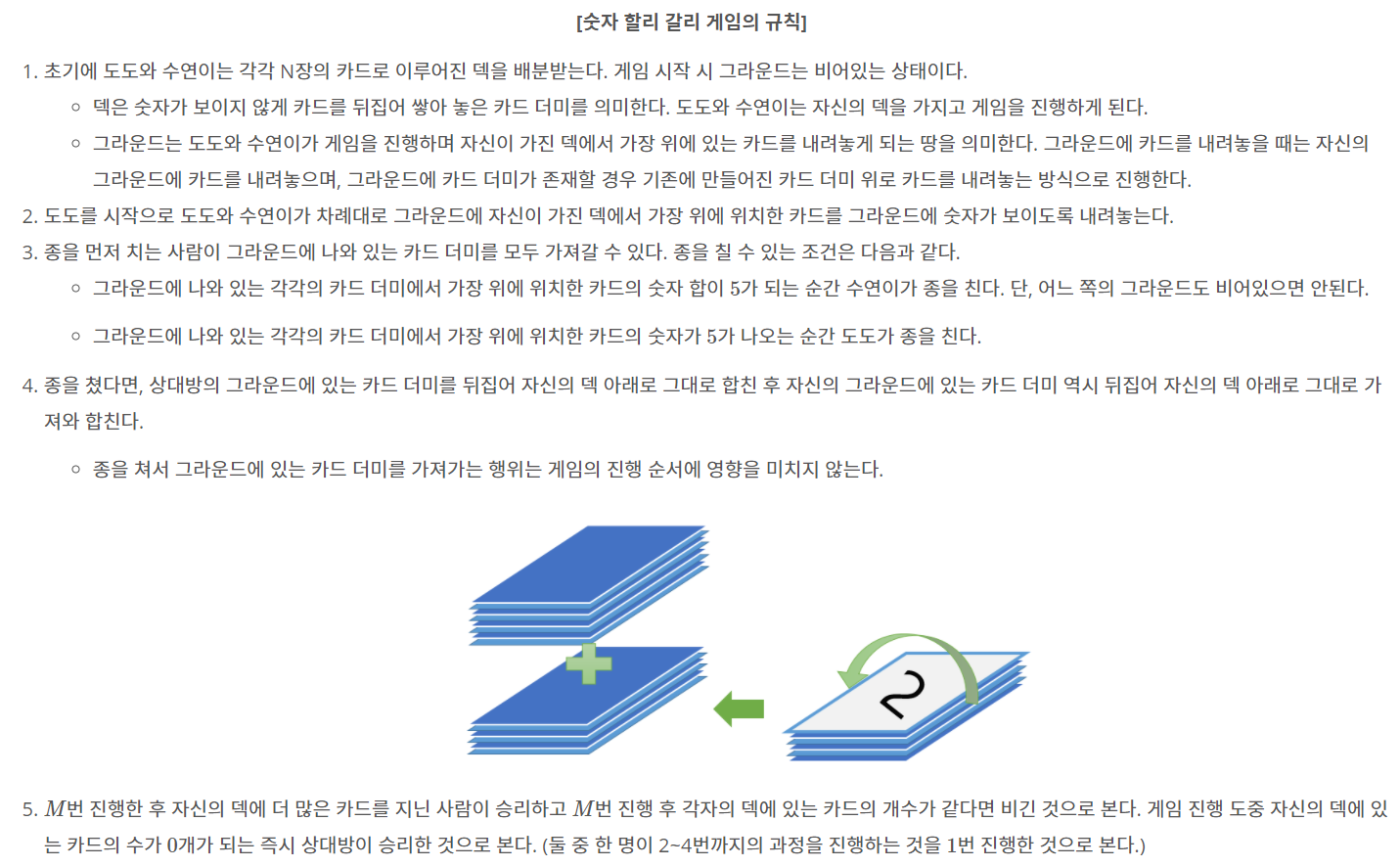์ฒซ์งธ ์ค์๋ ๋๋์ ์์ฐ์ด๊ฐ ๊ฐ์ง๋ ์นด๋์ ๊ฐ์ $N$($ 1 \leq N \leq 30\,000$)๊ณผ ๊ฒ์ ์งํ ํ์ $M$($ 1 \leq M \leq 2\,500\,000$)์ด ์ฃผ์ด์ง๋ค. ๋์งธ ์ค๋ถํฐ $N$๊ฐ์ ์ค์๋ ๋์ด์ฐ๊ธฐ๋ก ๊ตฌ๋ถํ์ฌ ๋๋์ ์์ฐ