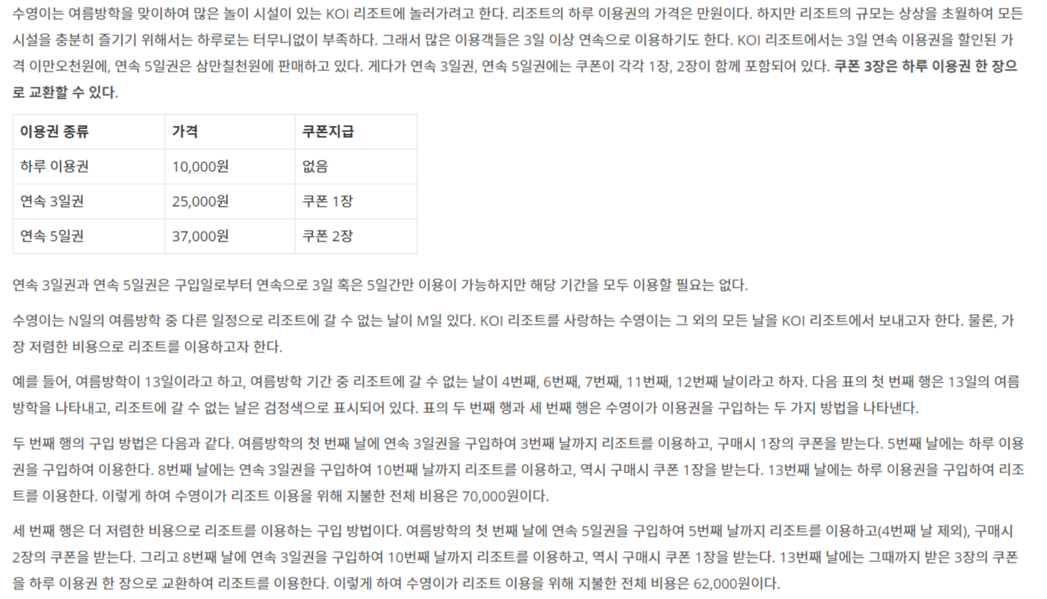 1์ผ๊ถ, 3์ผ๊ถ, 5์ผ๊ถ๊ณผ ๊ทธ์ ๋ฐ๋ฅธ ์ฟ ํฐ์ ์ฌ์ฉํด์ ๋ฆฌ์กฐํธ ์ด์ฉ์ ์ํ ์ต์ ๋น์ฉ์ ๊ตฌํ๋ dp ๋ฌธ์ ์ด๋ค.